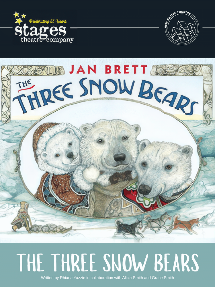 The Three Snow Bears, directed by Sandy Boren-Barrett and Sara Pillatzki-Warzeha with music composed by P. Ossie Kairaiuak, is inspired by THE THREE SNOW BEARS by Jan Brett. The script was written by New Native Theatre Artistic Director and Founder Rhiana Yazzie in collaboration with Alicia Smith and Grace Smith. Alicia and Grace are Yupik from Pitka’s Point Tribal Village in Alaska.